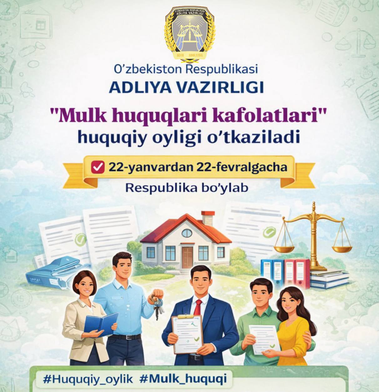Adliya vazirligi barcha fuqarolarni huquqiy oylikda faol ishtirok etishga chorlaydi!